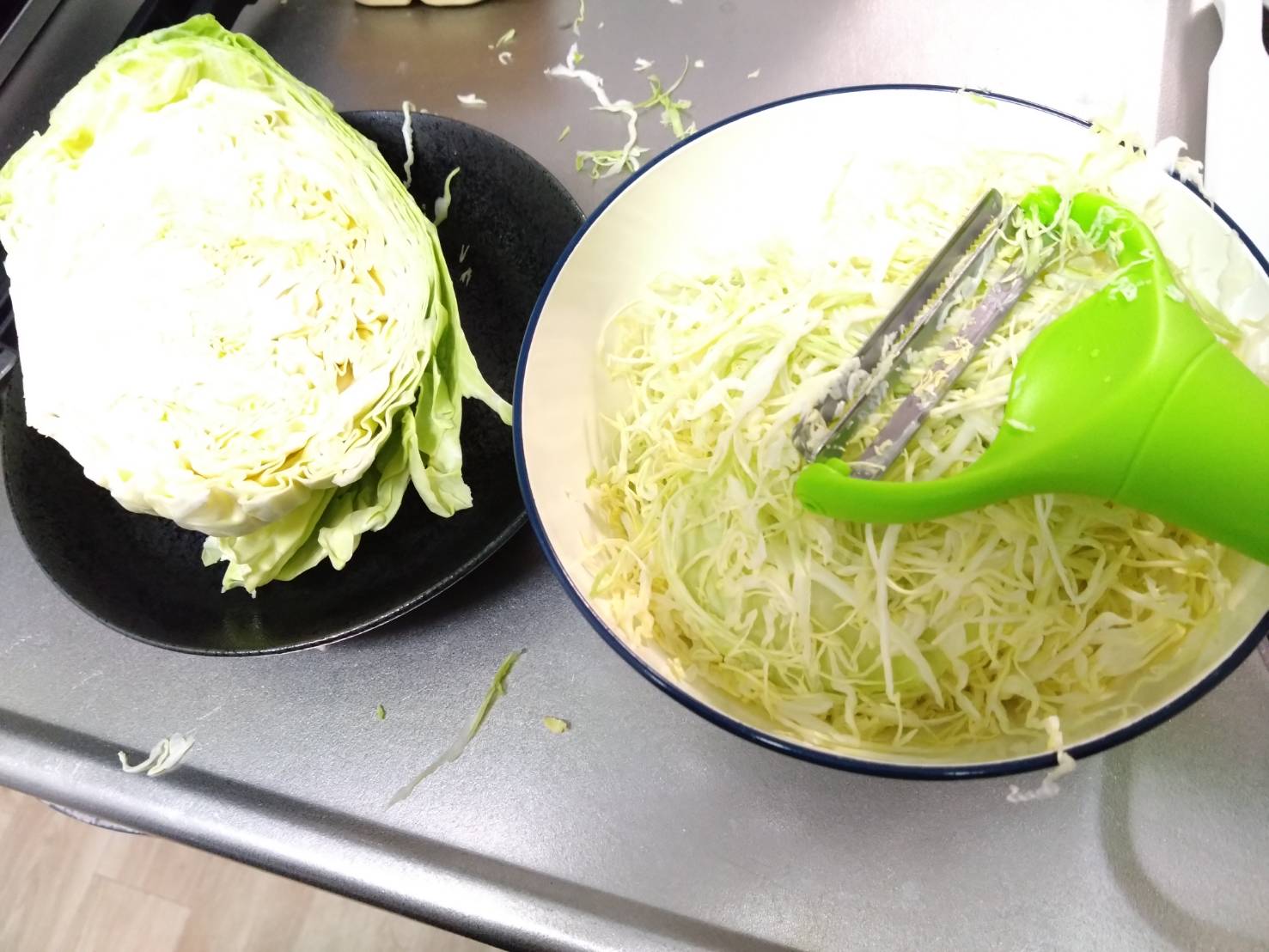 • 唯一の課題: 不器用なせいか、キャベツが結構飛び散ります(笑)。「大きいボウルの中でやる」「キャベツを上、キャベピィを下にしてスライスする」など、現在ベストな形を模索中です。キャベツ自体はネットでよくある長持ちさせる方法にて保存するので、半玉で1週間以上保ちます。カットキャベツだと、消費期限も短く買う回転数を上げないといけませんので。