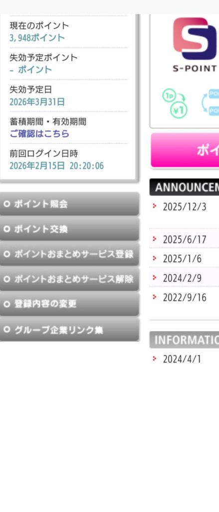| Sポイント | 3,948p | 【要注意】3月末に一部失効あり! 正直サイトにログインすることがほぼないので、今回期限迫りに気づけてよかったです👍 |