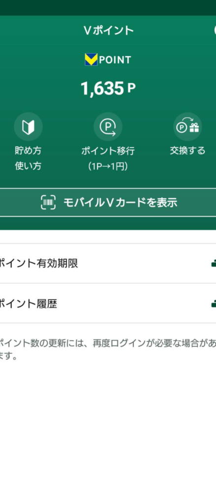 | Vポイント | 1,635p | 三井住友カードの積立や月々の支払いのメインカードです。割とこまめに支払いに充てる等して使用しているイメージです。 |