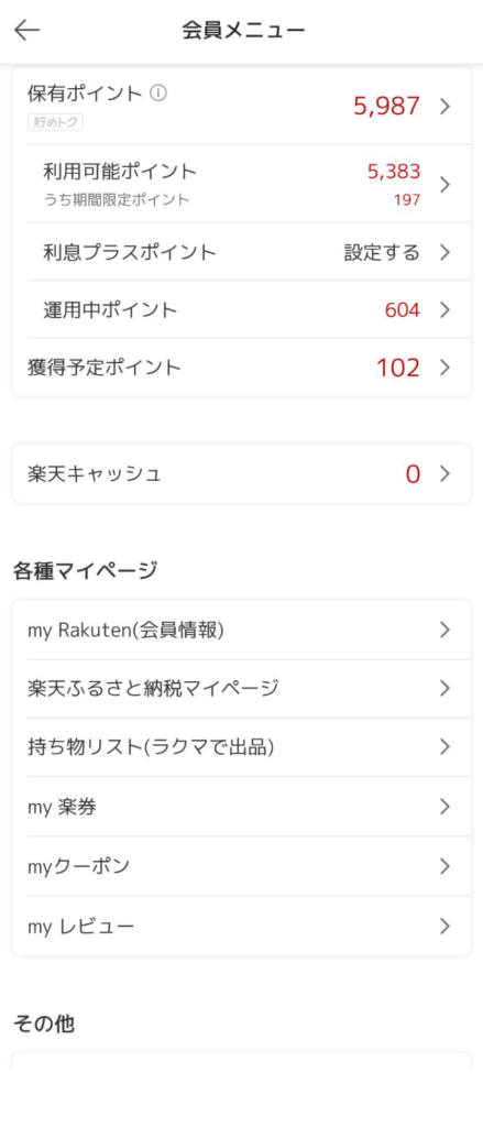 | PayPayポイント | 2,173p | コンビニ等の決済でコツコツ。ポイント運用が選択されていて、育っていました♪ |