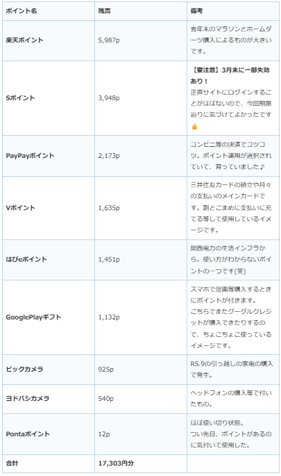 お昼休みでの会話にて、PayPayポイントがすごい溜まっているという話になりまして、ふとそういえば自分が各所で持っているポイントって合計でいくらぐらいになるんだろう・・・と気になり、棚卸しをしてみようとなりました!
